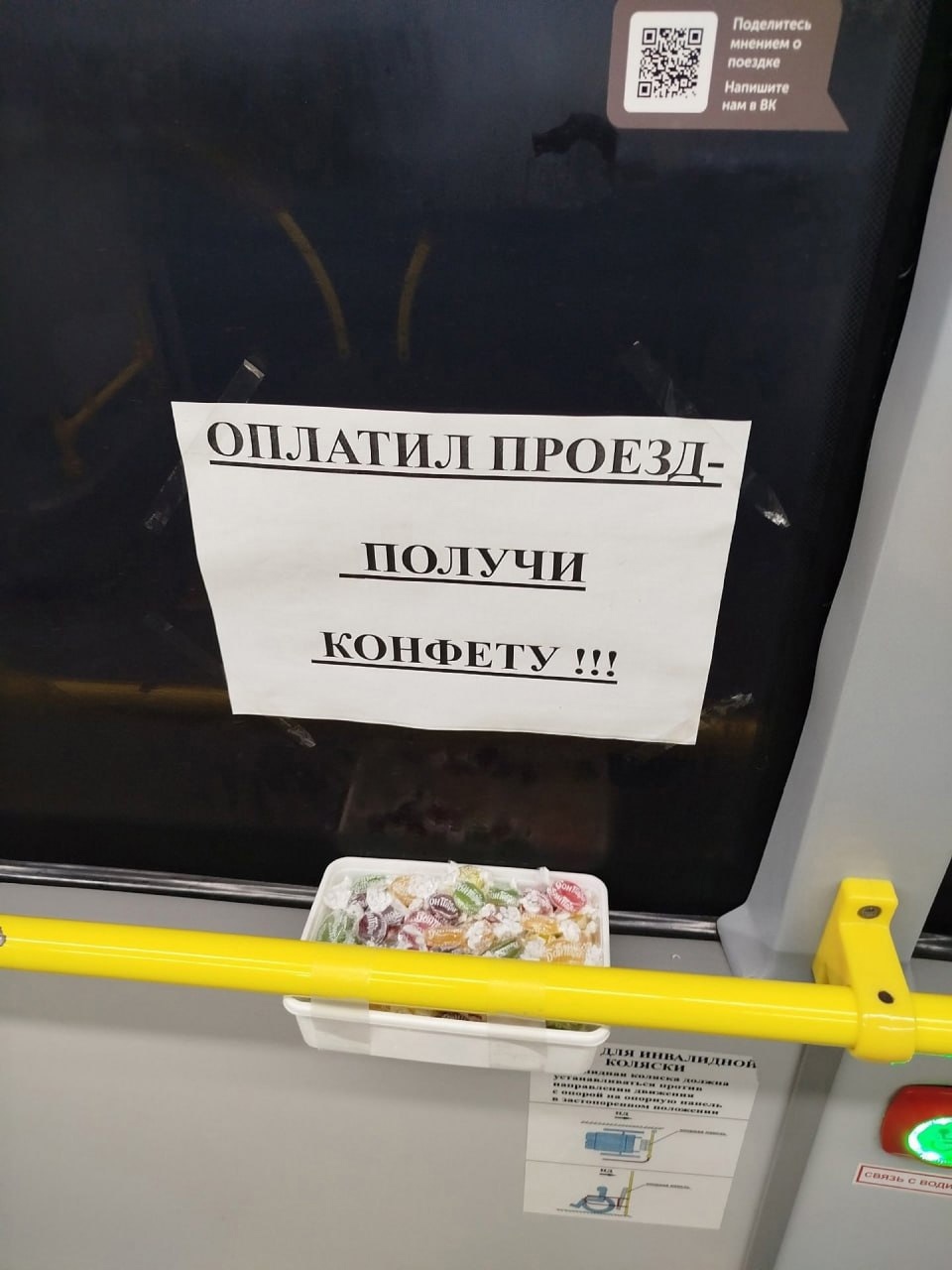 На автобусе маршрута №54, который оснащен бескондукторной системой оплаты, начали раздавать конфеты в качестве стимула…