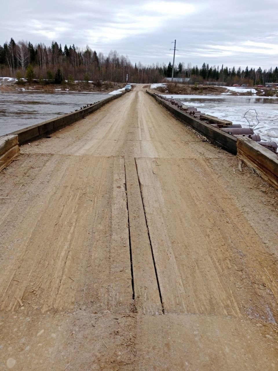 В период паводка движение по временно установленному мосту через реку Кама в деревне Светлаковы Афанасьевского…