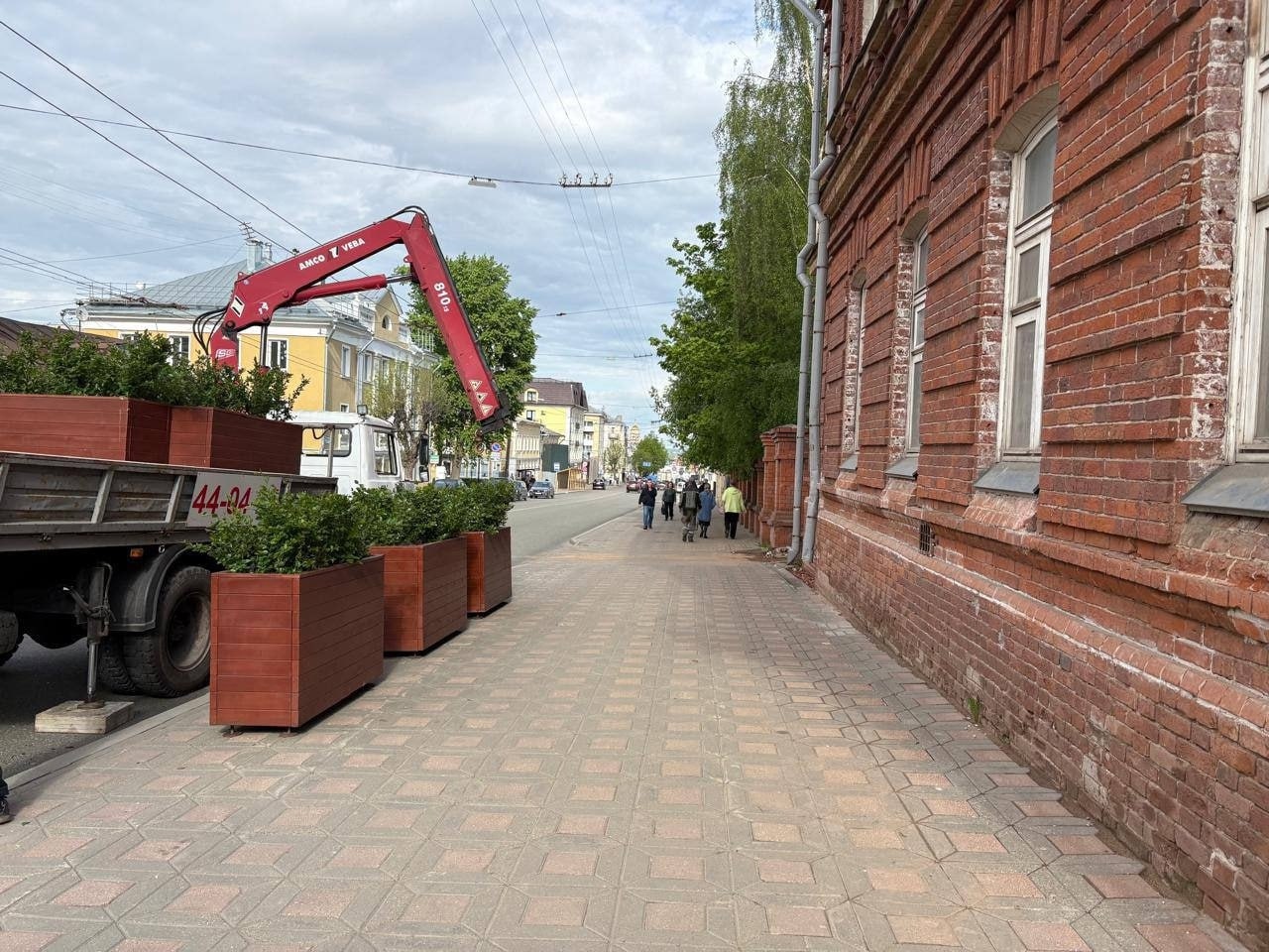 На улицах города Киров стартовала установка контейнеров с зелеными насаждениями для летнего времени.
