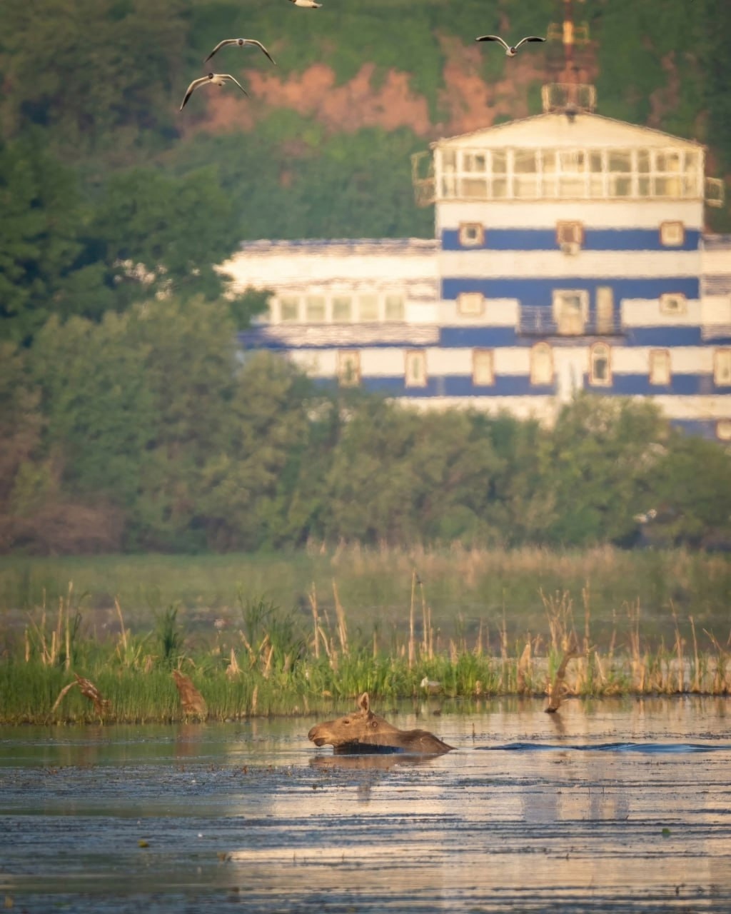 На фоне «Титаника» был запечатлён лось, наслаждающийся купанием. Фото: Михаил Анненков
