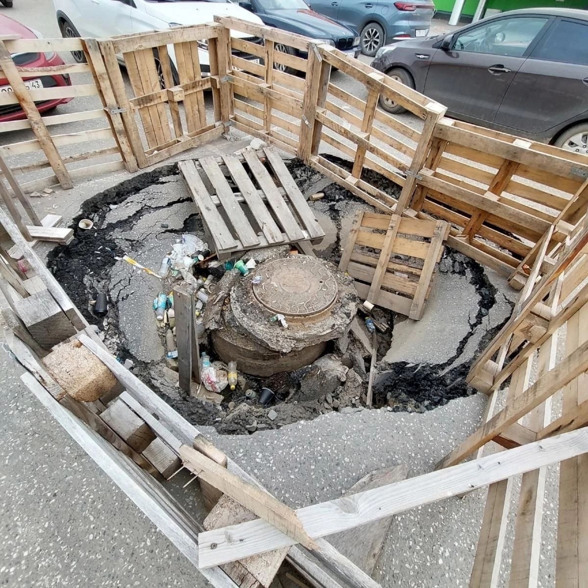 В Кирове на парковке торгово-развлекательного центра «Макси» произошло обрушение асфальтового покрытия — вокруг люка образовалась…
